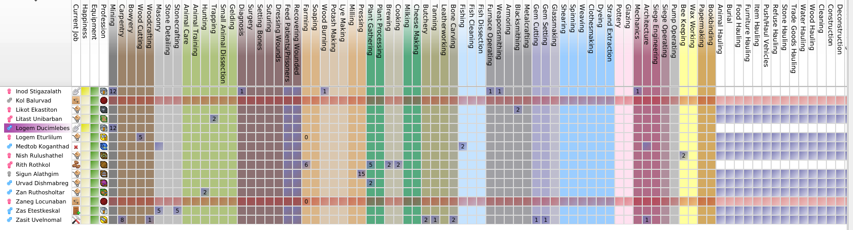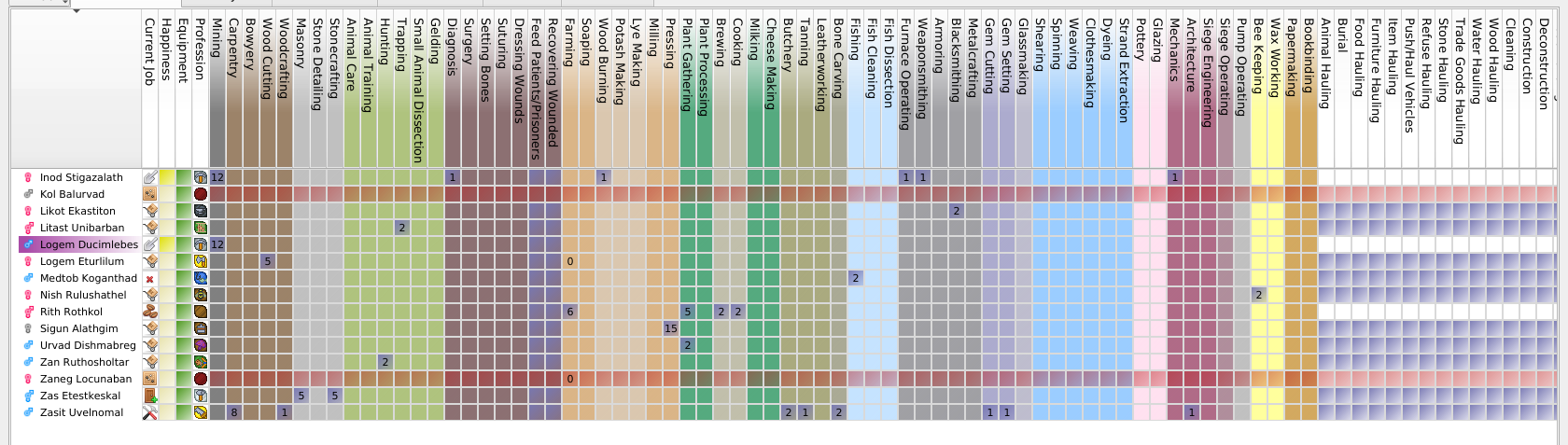Dans ce cas on a deux possibilité soit on demande à Zazit Uvelnomal d'arrêter la fabrication de tonneau, soit on demande à un autre nain de le faire à sa place. On va prendre la seconde solution car on a un nain qui n'a rien à faire Medtob Koganthad. On va donc lui attribuer la compétence d'architecte. On va également lui donner celle de maçon car le notre est également très occupé.