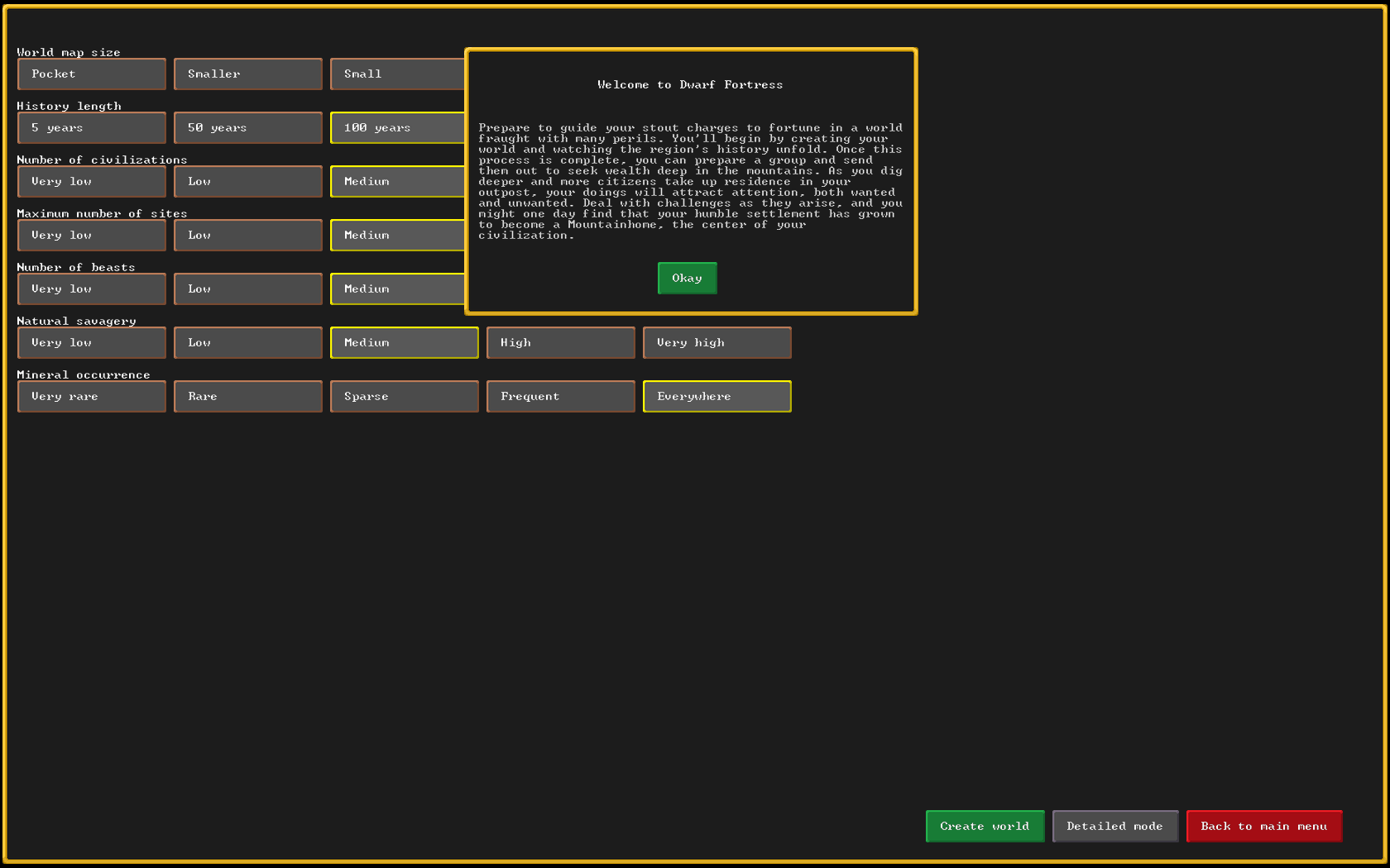 Chaque tuile de région correspond à 16 × 16 blocs de zone locale de 48 × 48 tuiles chacun. Donc même en Small le monde est immense. Plus le monde est grand plus la génération est longue mais plus tu as de choix d'emplacement pour ta forteresse. Tu n'es pas obligé de fabriquer un nouveau monde à chaque fois que tu veux construire une nouvelle forteresse. Tu peux construire plusieurs forteresse dans un même monde et tu peux même visiter tes forteresses en mode Aventurer. Pour le tuto je vais utiliser Small, mais si tu le souhaites, tu peux laisser sur medium