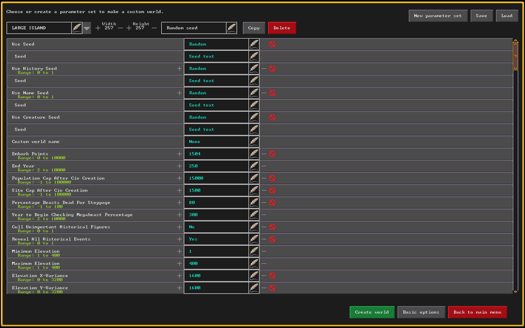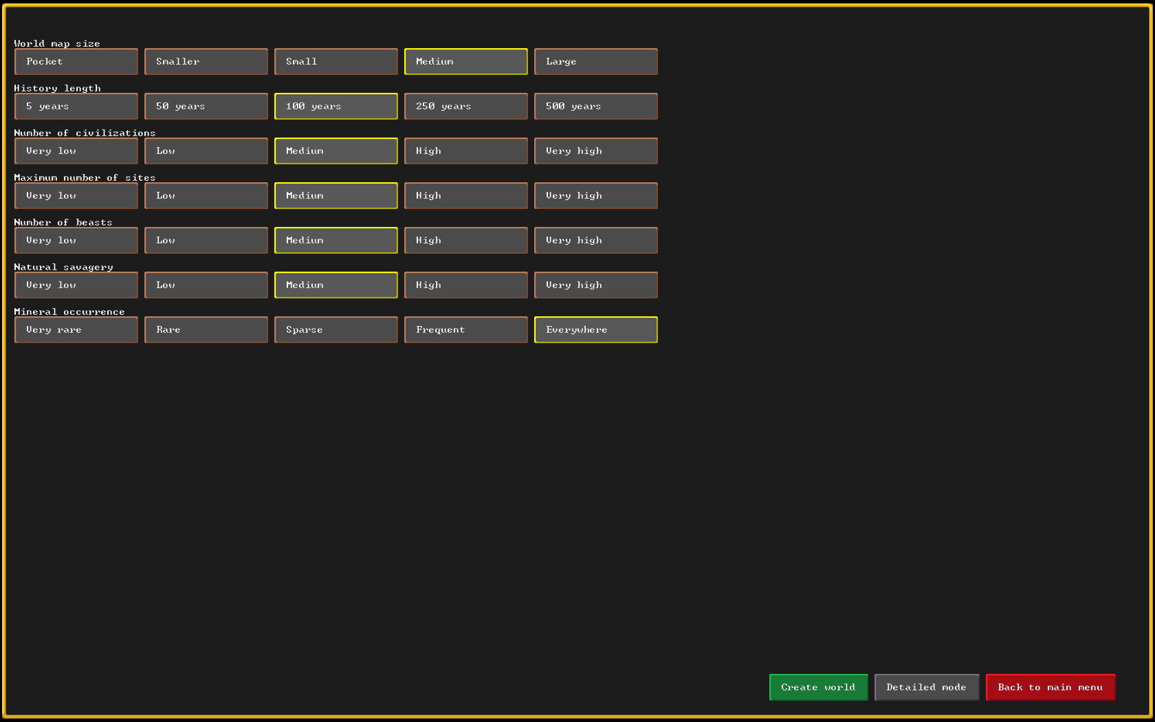 Plus l’histoire est longue moins tu risques de rencontrer des méga-bêtes et des titans qui sont des monstres colossaux des origines du monde, très puissant qui sont une menace très grave pour ta forteresse. Une histoire longue est surtout utile en mode aventurier. On va laisser le mode History sur sa valeur par défaut 100 ans.