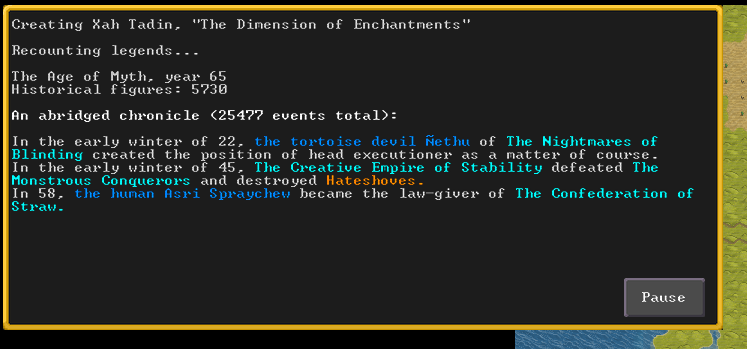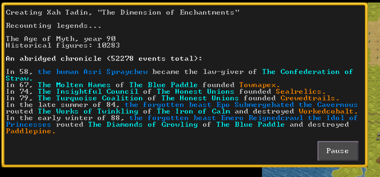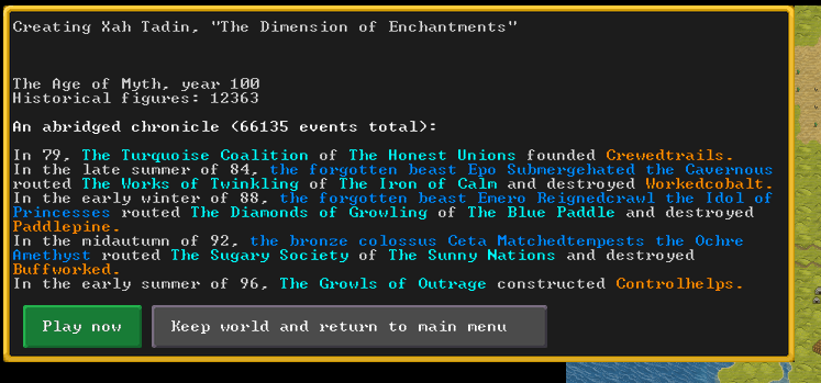 Je vais citer Wikipédia : « Pour jouer à l'un des modes de jeu proposés, il est nécessaire de créer un monde. La topographie du monde, l'emplacement des différentes civilisations (nains, humains, elfes et autres gobelins), leurs histoires et personnages importants, les diverses divinités, ainsi que des éléments culturels, comme des poèmes ou des livres, sont générés de façon procédurale (création de contenu numérique à une grande échelle (en grande quantité), de manière automatisée répondant à un ensemble de règles définies par des algorithmes).