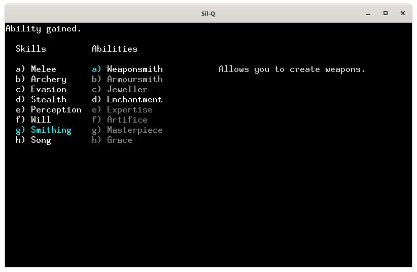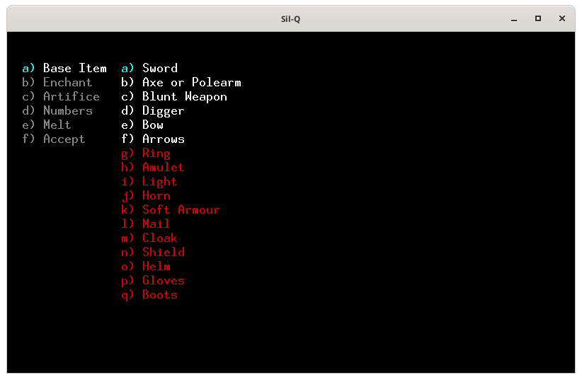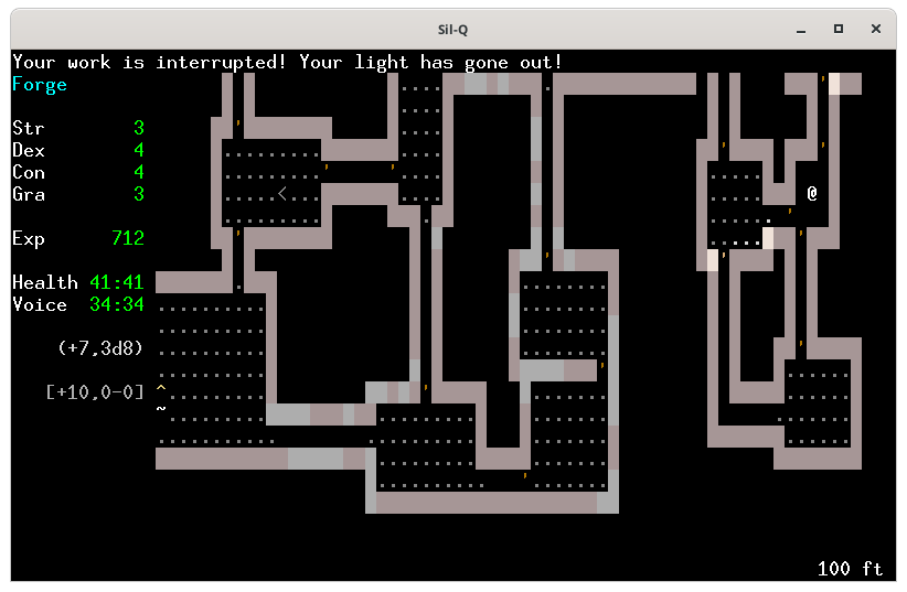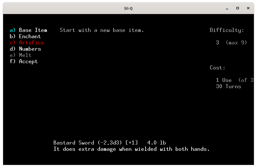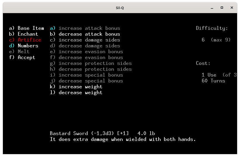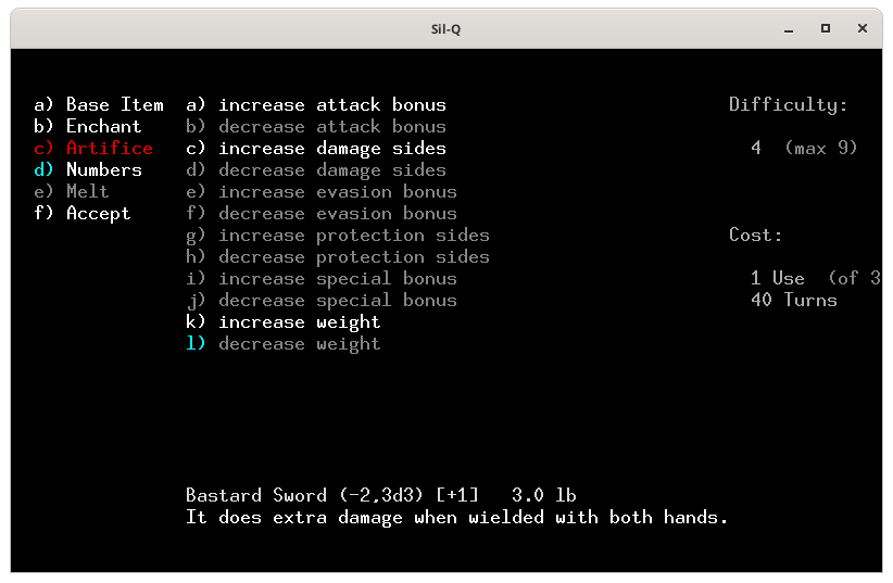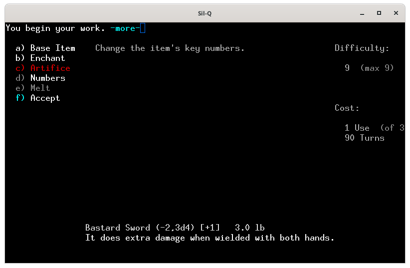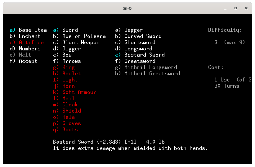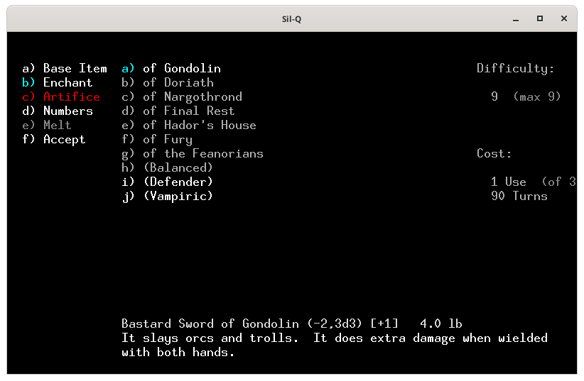 Pour te montrer comment on utilise une forge, j'ai créé un perso dont voici les caractéristiques.On ne peut pas forger si ont n'a pas les compétences et les capacités, j'ai pris les capacités : fabricant d'arme et d'enchantement.Voici la forge, tu en trouves forcement une aux niveaux 100 puis 300 et 500. Pour utiliser la forge tu places ton perso sur le 0 (zéro) et tu tapes 0 (zéro)Voici le menu de la forge. Le a) sert à choisir l'objet que tu veux fabriquer, le b) c'est pour lui apposer un enchantement, le c) pour utiliser un artifice, le d) pour modifier les caractéristique de ton objet, le e) pour fondre un objet et f) pour lancer la fabrication. Quand tu arrives seul le a) est actif, car tant que tu n'as pas sélectionné ce que tu veux faire, tu ne peux activer les autres actions.Voici la liste des objets que l'on peux fabriquer. En blanc ceux qui nous sont autorisés et en rouge ceux que l'on ne peut fabriquer, car on a pas les capacités adéquates. Je choisis une épée, le a).La liste des épées. Tout en bas tu as les caractéristiques de base de l'arme. À droite Difficulty représente la difficulté pour fabriquer cet objet. Tu as un maximum de 9 points qui correspond à ta valeur en Smithing, la dague ne présente aucune difficulté. En dessous le coût de fabrication de l'objet, la dague te coûte 1 utilisation de la forge sur 3 possible (tu peux donc potentiellement fabriquer 3 objets dans cette forge) et prendra 10 toursJe choisis de faire une épée bâtarde qui à 3 de difficulté, coûte 1 utilisation de forge et prend 30 tours de jeux. J'appuie sur e et tu vois qu'une partie des actions du menu de gauche te sont maintenant accessible. De base l'épée bâtarde à un malus de -2 à l'attaque, fait 3d3 dégâts et à un bonus de +1 a la défense.Je retourne dans le menu de gauche avec la flèche ← l'objet que l'on veut fabriqué est marqué en bas.Je tape sur b pour voir les enchantements disponibles. Il n'y en à que 3 et les 2 derniers entre () sont maudit. L'enchantement Gondolin permet d'avoir un avantage contre les orcs et les trolls, mais sont niveau de difficulté est de 9 notre maximum on ne pourra donc faire aucune autre amélioration si on le choisi.Si l'on tape sur d on peut augmenter le bonus d'attaque, augmenter les dégâts, ou augmenter ou diminuer le poids de l'arme.Augmenter le bonus d'attaque amène la difficulté à 6 et tu ne peux le faire qu'une fois et il te faut 60 tours, dans la description ton épée est passée de (-2, 3d3) à (-1, 3d3).Augmenter les dégâts amène la difficulté à 8 et tu ne peux le faire qu'une fois et il te faut 80 tours, dans la description ton épée est passée de (-2, 3d3) à (-2, 3d4).Diminuer le poids de ton arme te coûte 1 difficulté par 1lb et tu peux le modifier par 1/2 lb et il te faut 10 tours/ lb..Je décide d'augmenter les dégâts et de diminuer le poids de l'arme pour avoir plus de possibilité de critiques. Je retourne dans le menu de gauche avec ← et je tape sur f pour lancer la fabricationLa construction commence.Haaa! mer… mon travail s’arrête. Je n'ai plus de lumière.Je rallume une torche. Et je retape sur 0Il reste 79 tours je rappuie sur f pour poursuivre mon travail.Voila j'ai fabriqué mon épée.J'arbore fièrement mon épée toute neuve que je me suis forgé avec mes petites mains.
