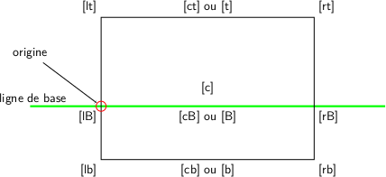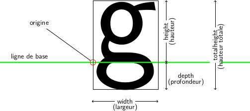 LATeX place cet origine sur une ligne appelée ligne de base (dessinée en vert). Tu peux remarquer que cette origine n’est pas toujours au coin en bas à gauche (lettres p et g).