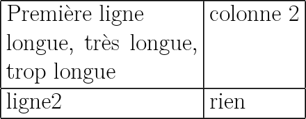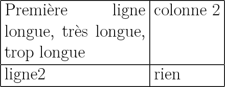 Cette commande permet de fixer la largeur de la colonne. Elle reconnait toutes les unités comprises par LaTeX (voir fiche Unités \& longueurs). Le même tableau que précédemment avec une première colonne fixée à 3 cm.